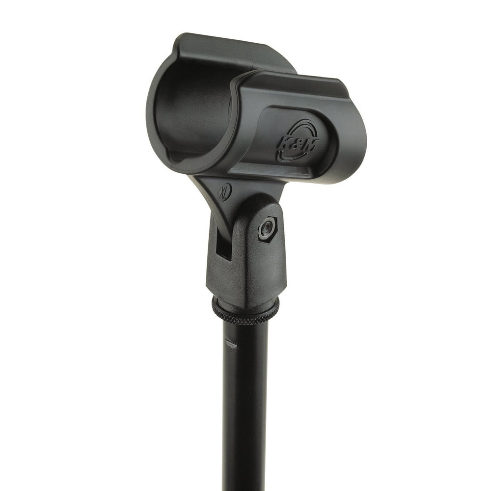 The K&M 85070 Microphone Clip is an elastic clip made from high-quality plastic, designed to securely hold most popular microphones with a shaft diameter ranging from 34 mm to 40 mm (1.339 inches to 1.575 inches). Its unique construction allows the microphone to be attached and engaged at the center, facilitating quick and easy mounting or removal. The clip features both 3/8" and 5/8" threaded connectors, ensuring versatile compatibility with a wide range of microphone stands and accessories. Finished in sleek black, it adds a professional touch to any setup.