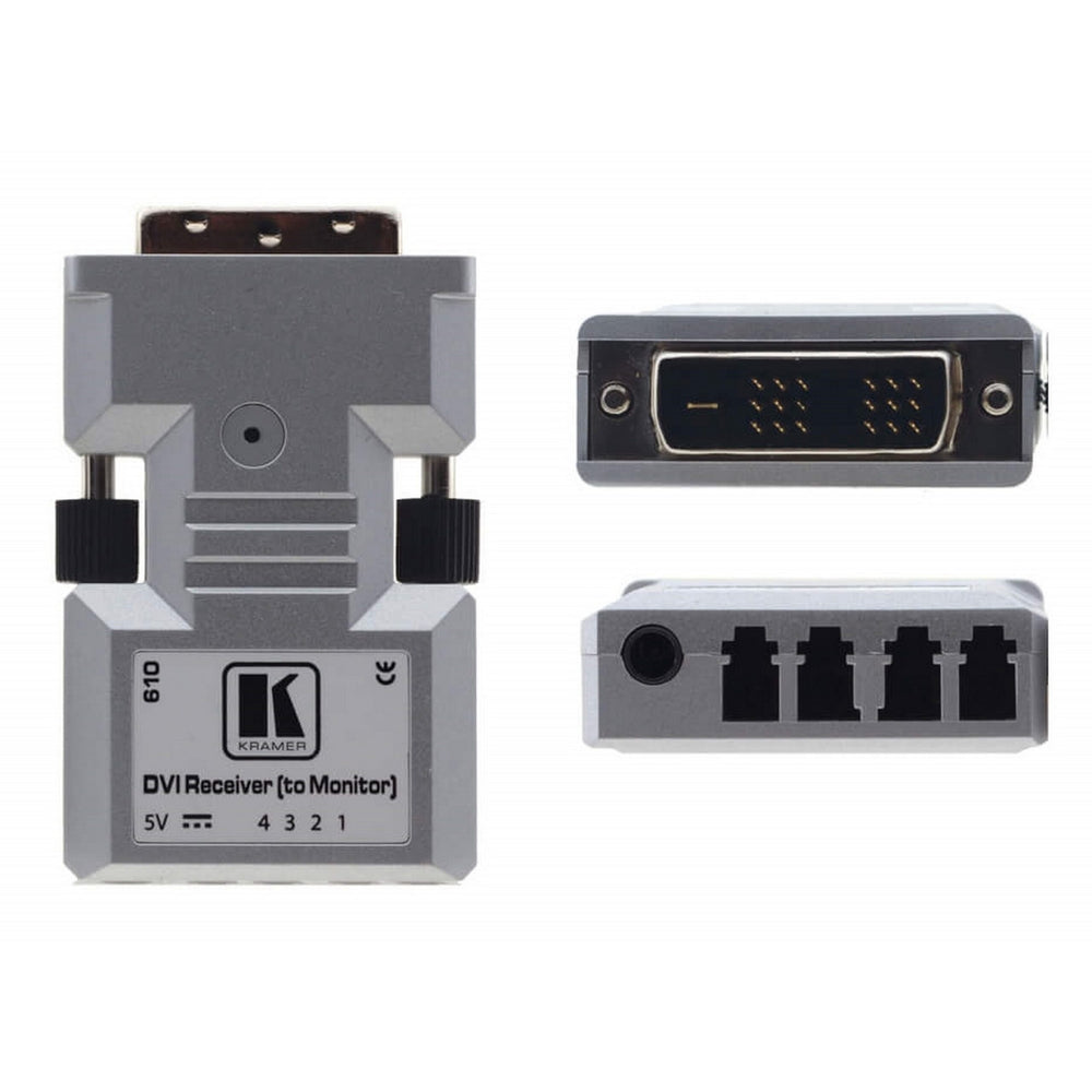 The 610R is a detachable optical device for receiving DVI signals with resolutions of up to 1920x1200 at 60Hz over LC optical cable. The 610R receives fiber optic signals sent by the 610T or a Kramer digital matrix and converts them into DVI signals.