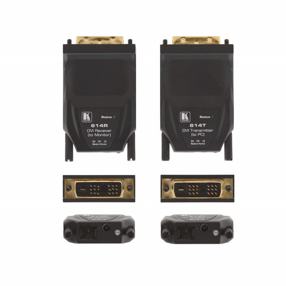 The 614T and 614R are a small and lightweight, detachable optical transmitter and receiver pair. They transmit uncompressed DVI resolutions of up to 1920x1200 at 60Hz using one multimode fiber optic cable with SC connectors. The 614T converts the DVI signal to an optical signal that it transmits to the 614R. The 614R decodes the optical signals back to a DVI signal.