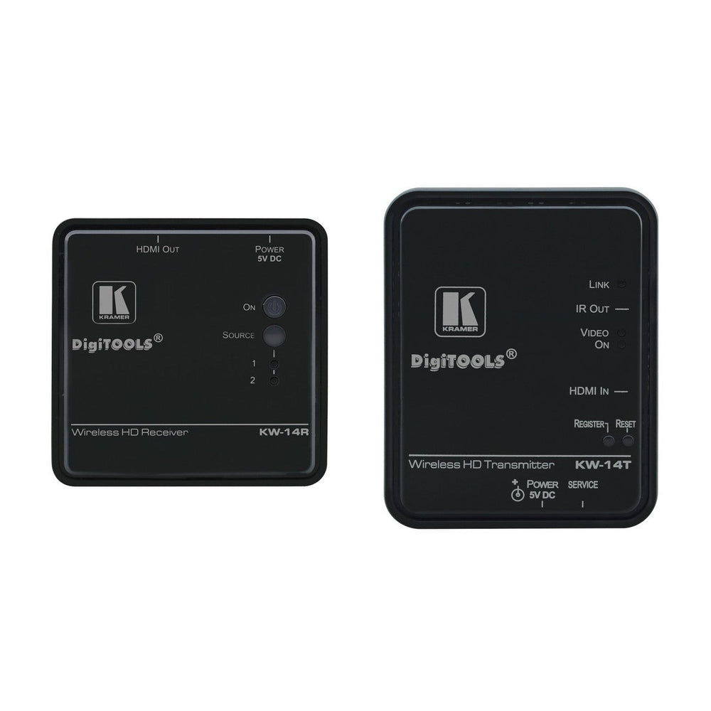 The KW-14T and KW-14R are a high-definition, wireless, HDMI transmitter/receiver pair for indoor use. Up to four KW-14R receivers can receive from one KW-14T transmitter and up to three KW-14T transmitters can be paired with one KW-14R receiver. The KW-14T and KW-14R pair comes pre-associated.