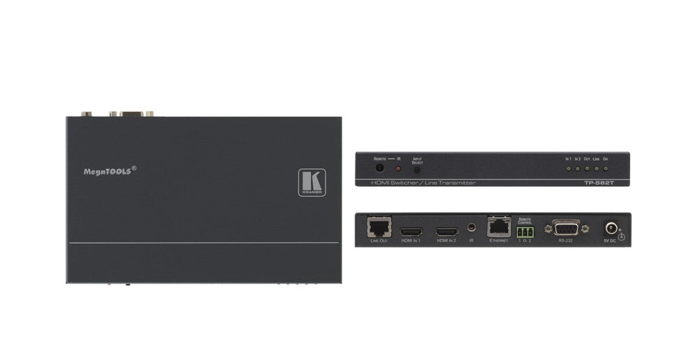 Kramer TP582T 2 x 1 HDMI Plus Bi-Directional RS232, Ethernet & IR over Twisted Pair Switcher / Transmitter allows you to transmit HDMI, Ethernet 100BaseT, RS-232 and IR input signals. It takes 1 of the 2 HDMI inputs, and converts it with the Ethernet 100BaseT, RS-232 and IR input signals to a twisted pair signal. The device offers a maximum data transfer rate of up to 2.25 Gbps over a distance of up to 330ā (100m). Shielded twisted pair (STP) cables such as Kramer's BC-DGKat524, BC-DGKat623, or BC-DGKat723 cables can be used for optimum performance.