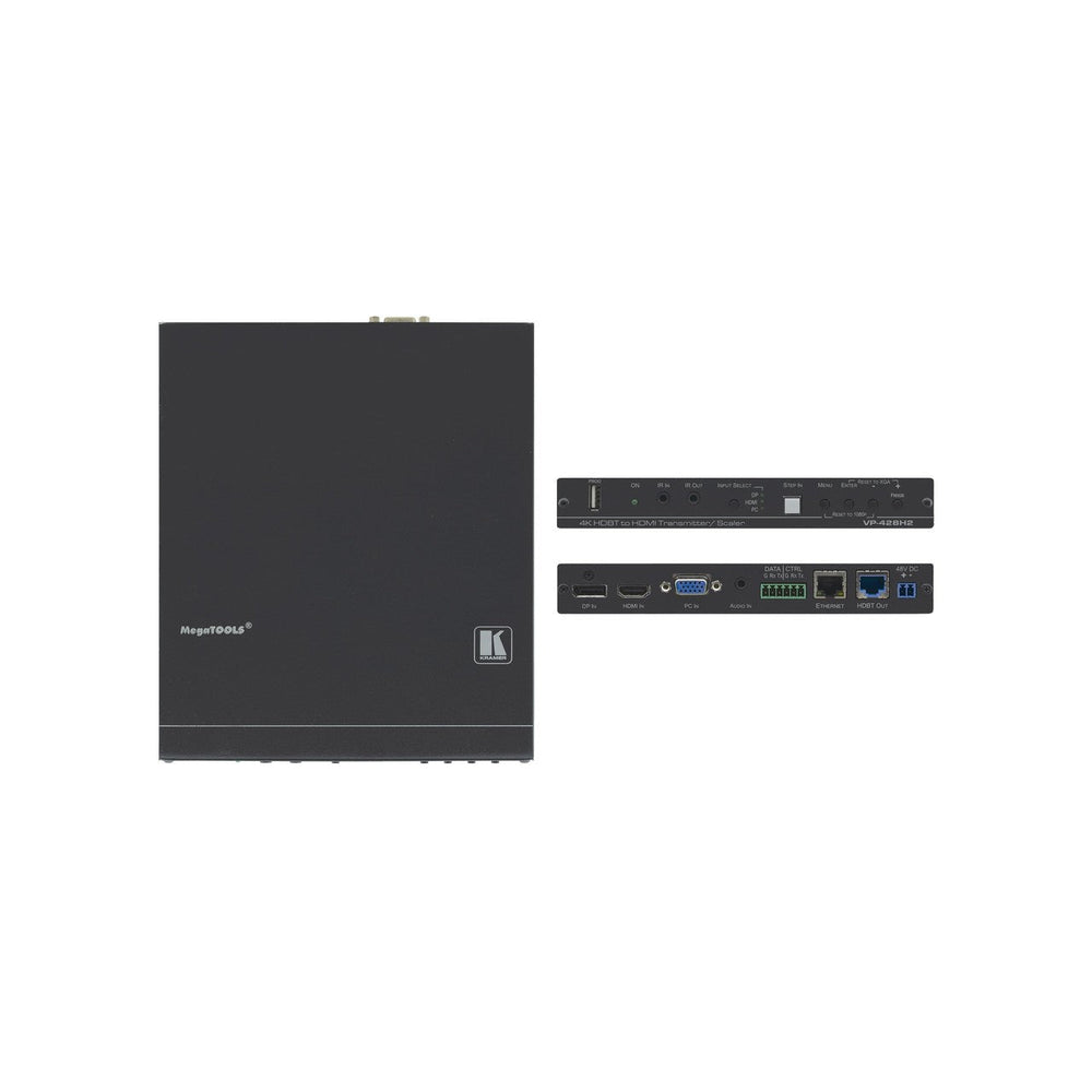 VP-428H2 is an HDBaseT 4K transmitter/scaler with HDMI, DP and VGA inputs. VP-428H2 supports HDBaseT tunneling of Ethernet, bidirectional RS-232 and IR signals, as well as PoE to provide power to the HDBaseT receiver. It receives the selected AV signal, up-scales, down scales or bypasses the video, according to the settings selected by the user, and converts it for sending via HDBaseT, together with the tunneled data and PoE.
