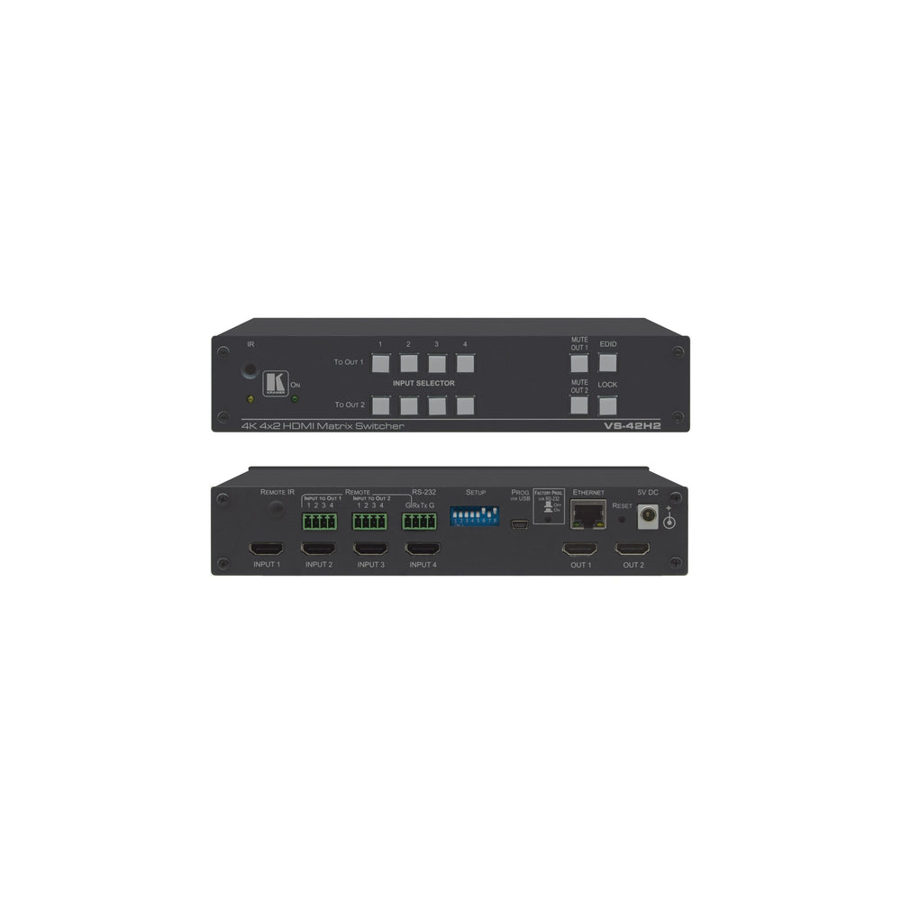 VS-42H2 is a high-performance 4x2 matrix switcher for 4K HDR HDMI signals. It reclocks and equalizes the signals and can route any one of four HDMI, HDCP-compliant sources (selectable) to any or all outputs simultaneously.