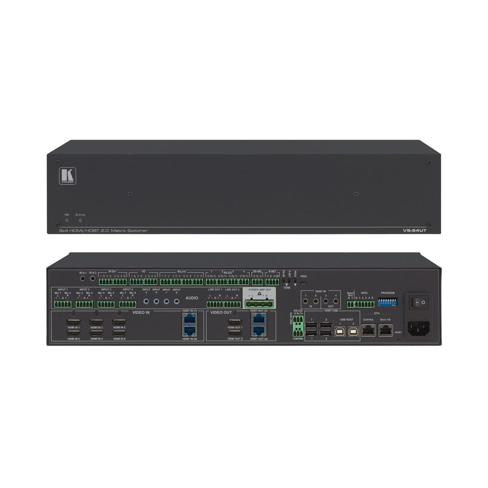 VS-84UT is an all-in-one 4K@60Hz (4:2:0) audio-video presentation system with integrated range extension and an integrated control system master. The unIt'switches the video, embeds the audio, and outputs the signal to both HDMI and HDBaseT 2.0 with USB extension and PoE on the HDBaseT output ports. Outstanding audio support includes balanced stereo audio, unbalanced stereo audio, and de-embedded audio sources that output to embedded audio, balanced stereo audio as well as a power amplified audio output.