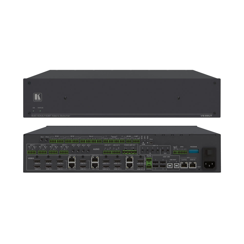 VS-88UT is an all-in-one 4K@60Hz (4:2:0) Audio-Video presentation system with integrated range extension and an integrated control system master. The unit switches the video, embeds the audio and outputs the signal to both an HDMI and an HDBaseT 2.0 with USB extension and PoE on the HDBaseT output ports. Outstanding audio support includes balanced stereo audio, unbalanced stereo audio, and de-embedded audio sources that output to embedded audio, balanced stereo audio as well as a power amplified audio output. VS-88UT includes a master room controller that can operate over Ethernet (LAN) with control ports that include: one bidirectional RS-485, four RS-232, four IR, four GPI/O, and eight relays to control a wide variety of AV devices. It includes a KNET connector interface that enables access to the master controller from auxiliary room controllers such as control keypads. The unit can also provide power to auxiliary room controllers via the KNET connectors. VS-88UT includes an Ethernet gateway to control and manage remote I/O ports.