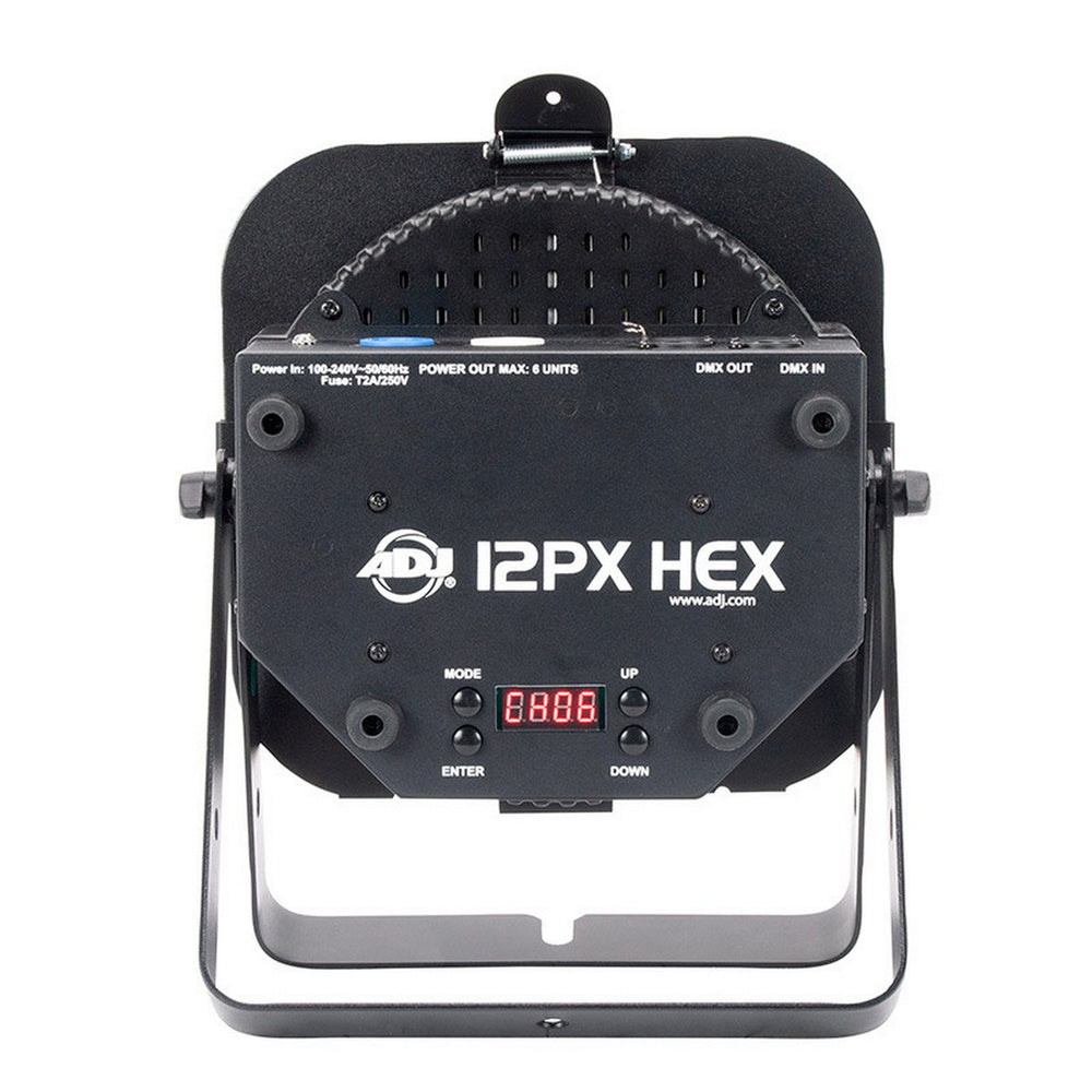 The ADJ 12PX HEX is a versatile LED Par fixture with 12 x 12-Watt, 6-IN-1 HEX LEDs and is made from all metal construction. With a 30-degree beam angle, users may produce wide washes with smooth color mixing from 63 built-in color macros utilizing red, green, blue, amber, white and UV LEDs. Not only is this LED Par great for lighting stages, but with its patent pending, intelligently designed, power and DMX connectors, itās great for uplighting a venue, or used as a stage wash.