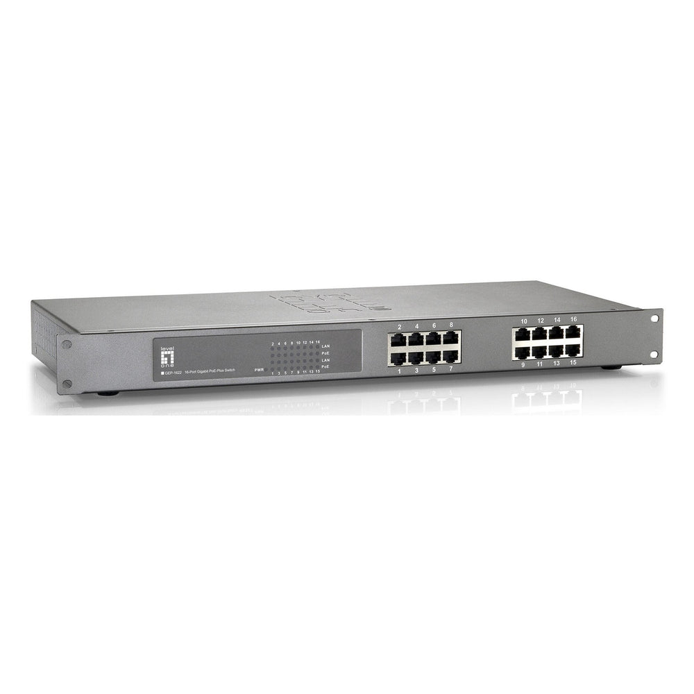 The LevelOne GEP-1622 is a Gigabit PoE-Plus Switch with 16 x 10/100/1000Base-T PoE-Plus ports. This switch is IEEE 802.3af/at compliant, providing power and data over a single Ethernet cable to any PoE device, with total power budget of 480W, up to 30W per port. Ideal for desktops, it is also 19-inch rack-mountable, which provides convenient and flexible installation. The GEP-1622 is designed for small-to-median businesses that prefers an affordable solution for PoE deploying infrastructure.