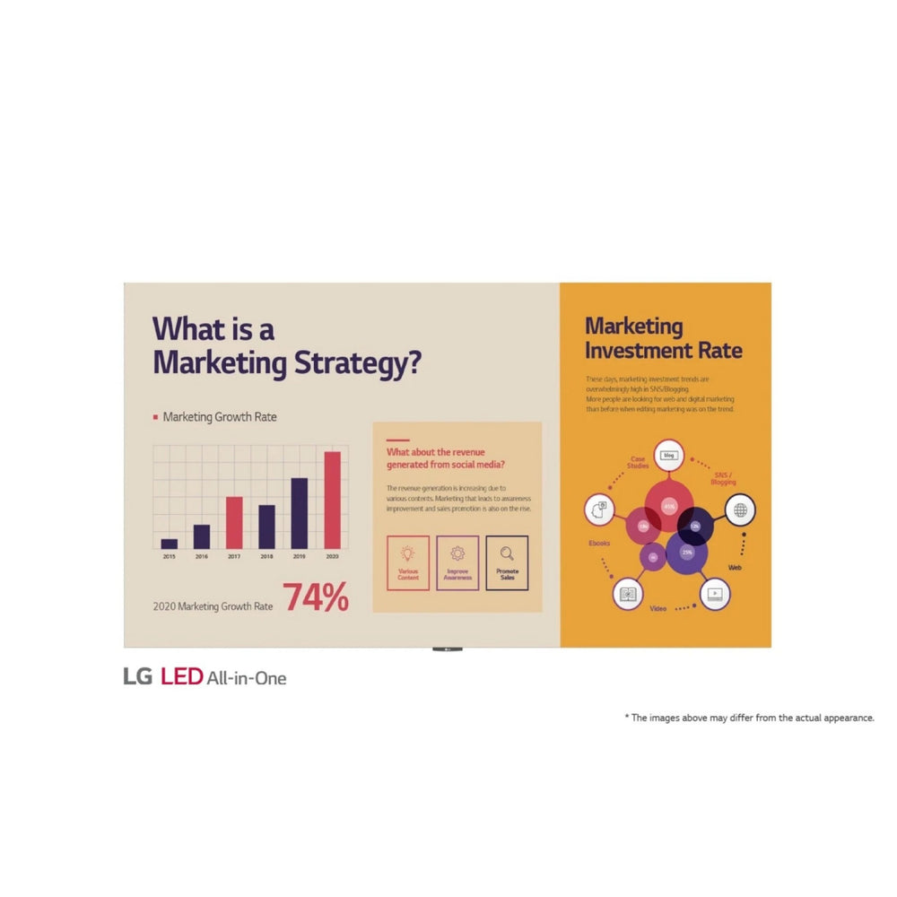 LG's All-in-one Essential series is a 136-inch large LED screen which includes an embedded controller. After a simple installation process, all you need to do is to turn on the screen with a remote control like a home TV.