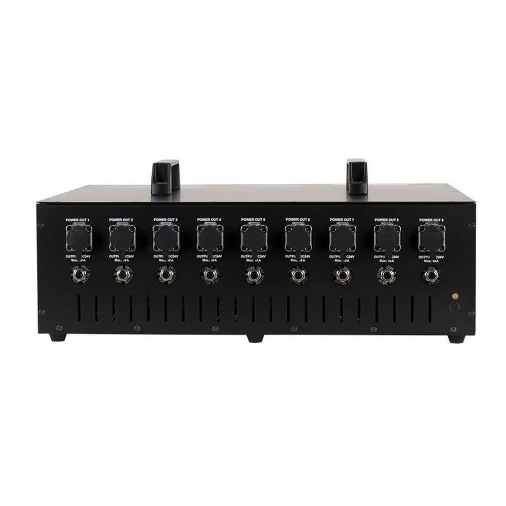 There are 9 power outputs with rubber protectors and 9 resettable breakers. There are two carrying hands on the top of the power supply, with rubber feet on the bottom.