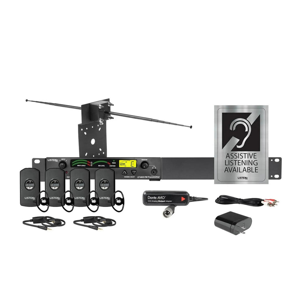 The Listen Essentials Level 2 Stationary RF System with Dante is ideal for venues of various sizes, from classrooms and conference centers to houses of worship and banquet halls. The system includes everything you need for a seamless setup, including a universal antenna kit, a rack-mounting kit for the transmitter (if desired), and assistive listening notification signage.