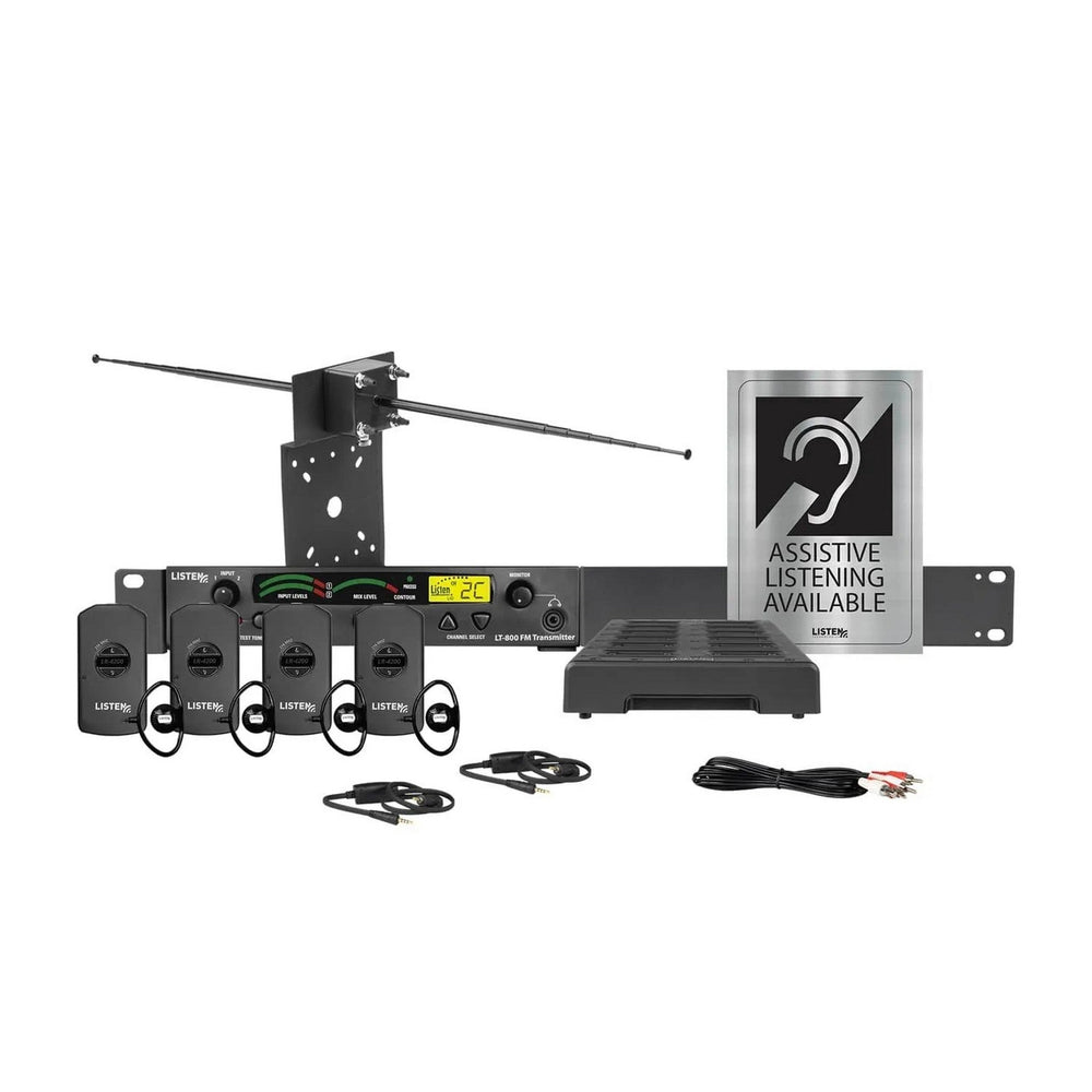 The LS-55 (216 MHz) features a high-fidelity, 216 MHz stationary RF transmitter (LT-800-216) and a versatile LA-122 Universal Antenna Kit for optimal signal distribution throughout your venue. The system also includes four (4) advanced LR-4200-216 iDSP receivers known for their exceptional audio quality. These receivers boast advanced DSP SQ noise reduction technology, significantly reducing background noise and ensuring a clear listening experience for patrons with hearing impairments. Additionally, the integrated neck loop/lanyard with DSP loop driver on the receivers enhances compatibility with T-coil hearing aids.