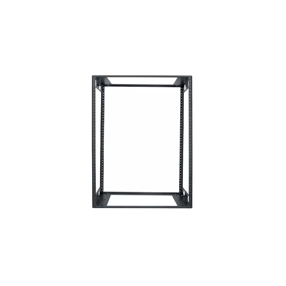 This open frame rack is designed with practicality in mind, featuring corner post mounting rails that are tapped 10-32, and punched for clean wire tie-off, facilitating effective cable management. The smooth black powder epoxy finish not only provides a sleek appearance but also protects the rack from wear and tear, ensuring longevity in various environments.