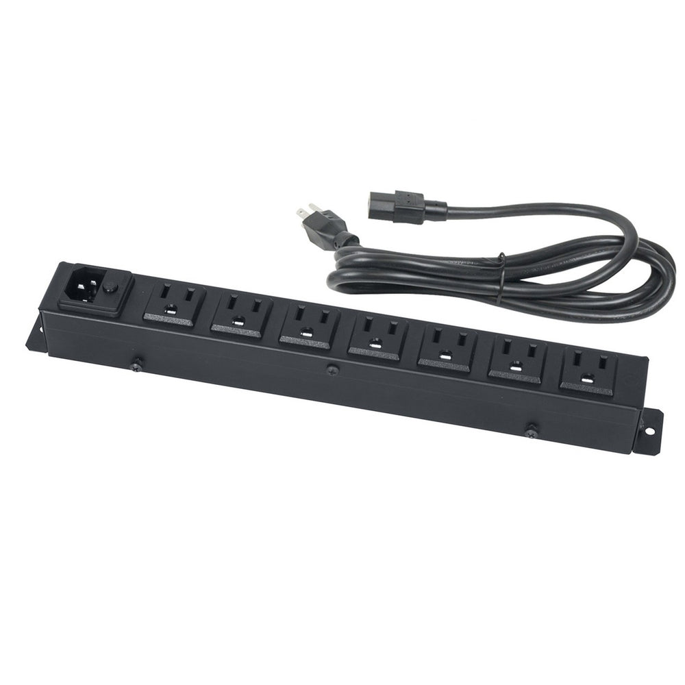 Compact AC power strip with 7 (15A) NEMA outlets is ideally suited for installation on a 19 in. rack shelf.