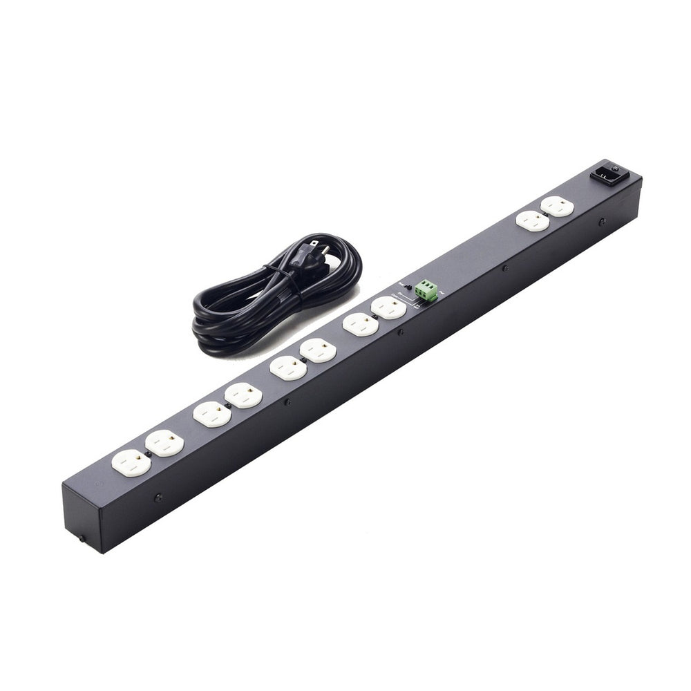 ETL Listed power strip with low voltage remote power control of connected devices shall be US-made, Lowell Model ACS-1510-RPC. Power rating shall be 15A with circuit breaker protection. Power strip shall include four switched and one un-switched NEMA 5-15R duplex receptacles. It shall also include a Remote Power control terminal for low voltage cable to be run from the strip to remote switch(es) or sequential control device(s). Chassis shall be heavy gauge steel measuring 30 in. x 2 in. x 2 in. finished in black powder epoxy. It shall be terminated with a detachable 6 ft. IEC cord with NEMA 5-15P plug. It shall install to cabinets with adjustable or fixed mounting rails and to walls and desk surfaces using multi-mount brackets and hardware provided.