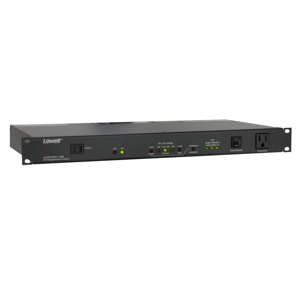 The AC control device shall be Lowell Model ACSPR-RPC1-1509 with surge protection, over/under voltage protection with auto re-set, remote power control circuitry, and EMI/RFI filtering. It'shall be an ETL Listed 15A device that provides safeguarded power distribution from a 1U rackmount chassis with three un-switched outlets (1 front, 2 rear) and six switched outlets that can be remotely controlled. It'shall include an alarm interface with lock on, lock off and switch lock functions. Front actuation shall be via a rocker switch. The steel chassis shall measure 19 in. x 9 in. x 1.75 in. and It'shall have a black powder epoxy finish.