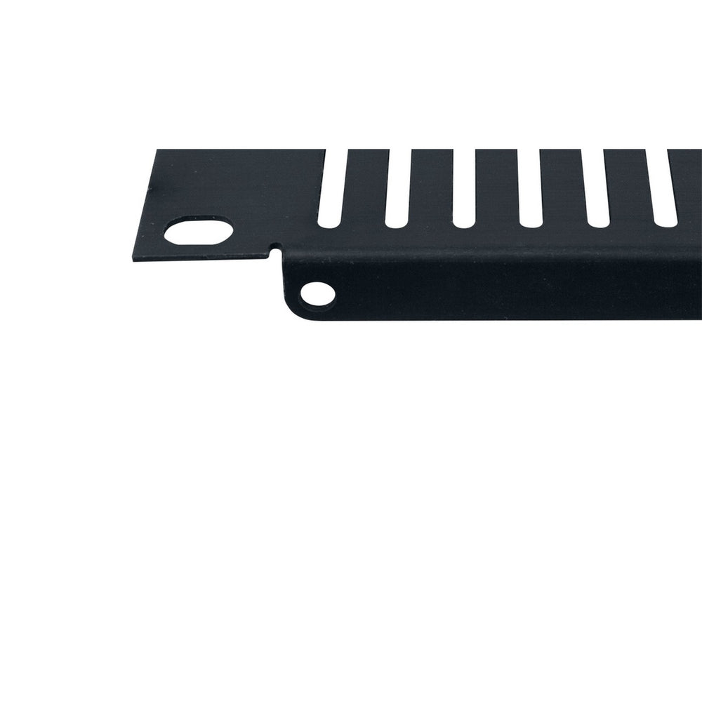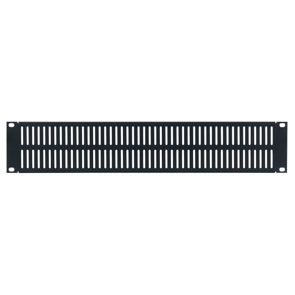 Aluminum rackmount panel with slotted vents and brushed black anodized finish.