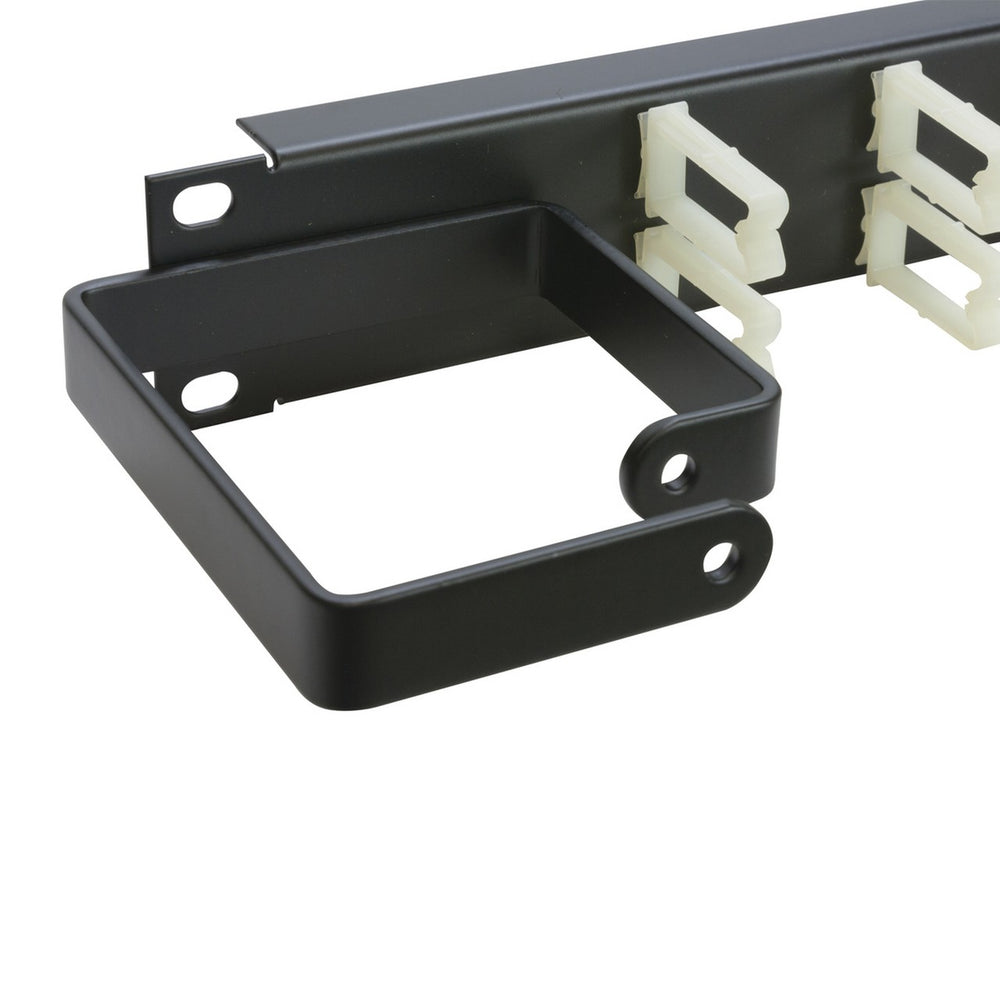 Rackmount panel with rotating flex-clips to organize cables. Optional D-rings on ends.