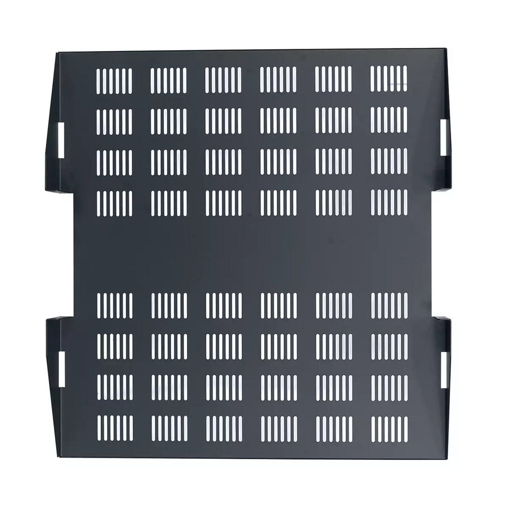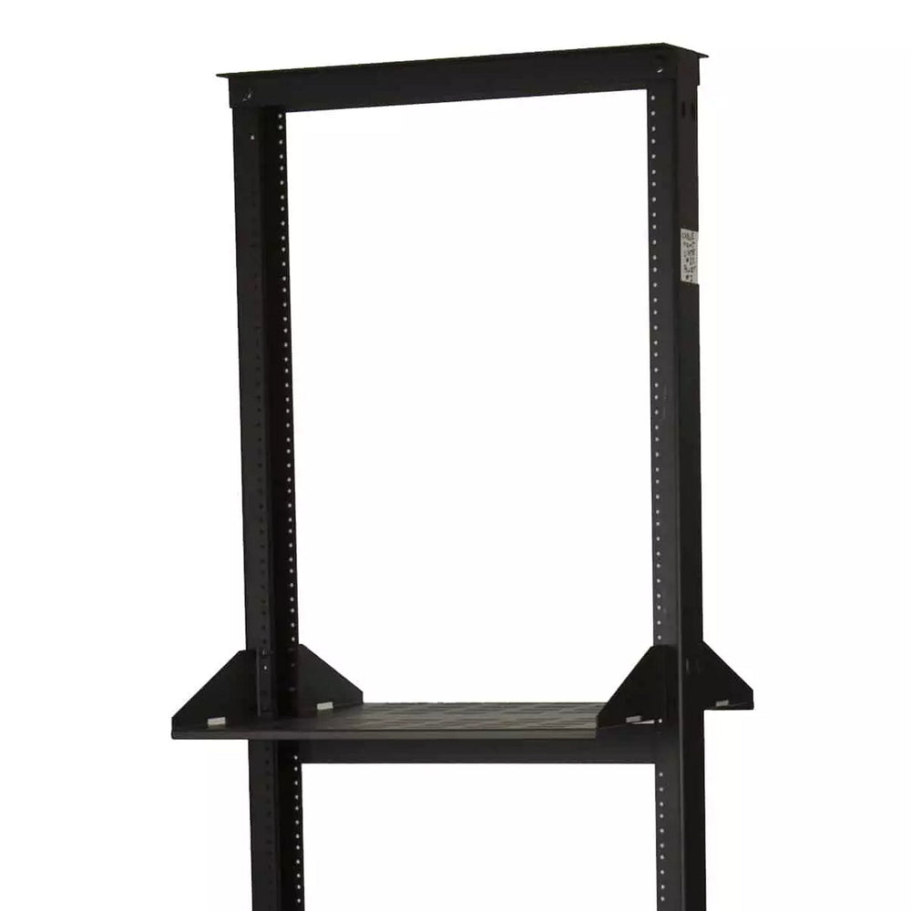 The CMSD Series Center Mount Shelf is a versatile solution designed for non-standard equipment, specifically compatible with two post racks that feature six-inch deep side channels. This shelf is constructed from one-piece 16-gauge steel, ensuring durability and strength, while its smooth black powder epoxy finish provides a sleek appearance. The vented base allows for passive heat dissipation, making it ideal for housing sensitive equipment that requires proper airflow.