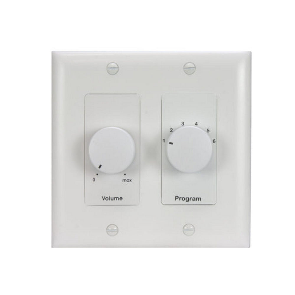 Six-source program selector switch plus volume control in a 2-gang wall plate.