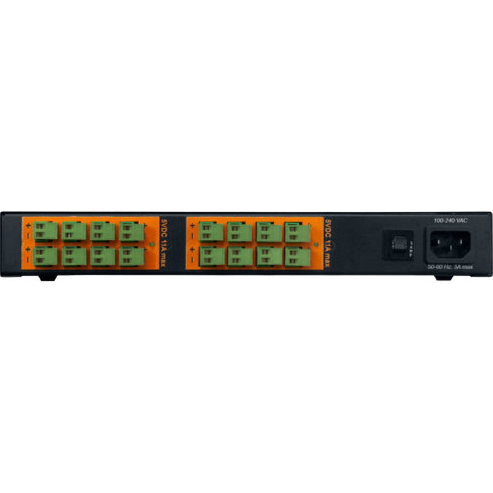 - Each unit features 2 voltage banks (color coded for easy identification of outputs). Each bank has eight outputs, available in various combinations of 5V@11A, 12V@16A, and 24V@8A