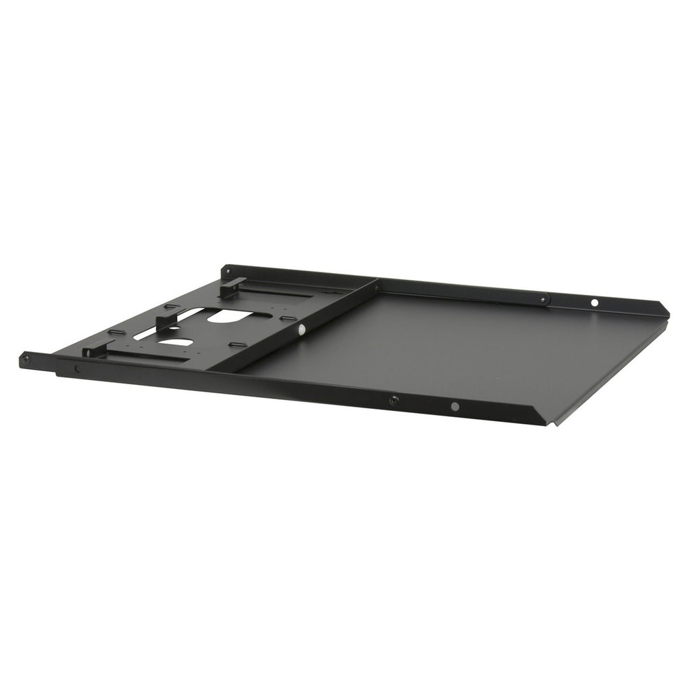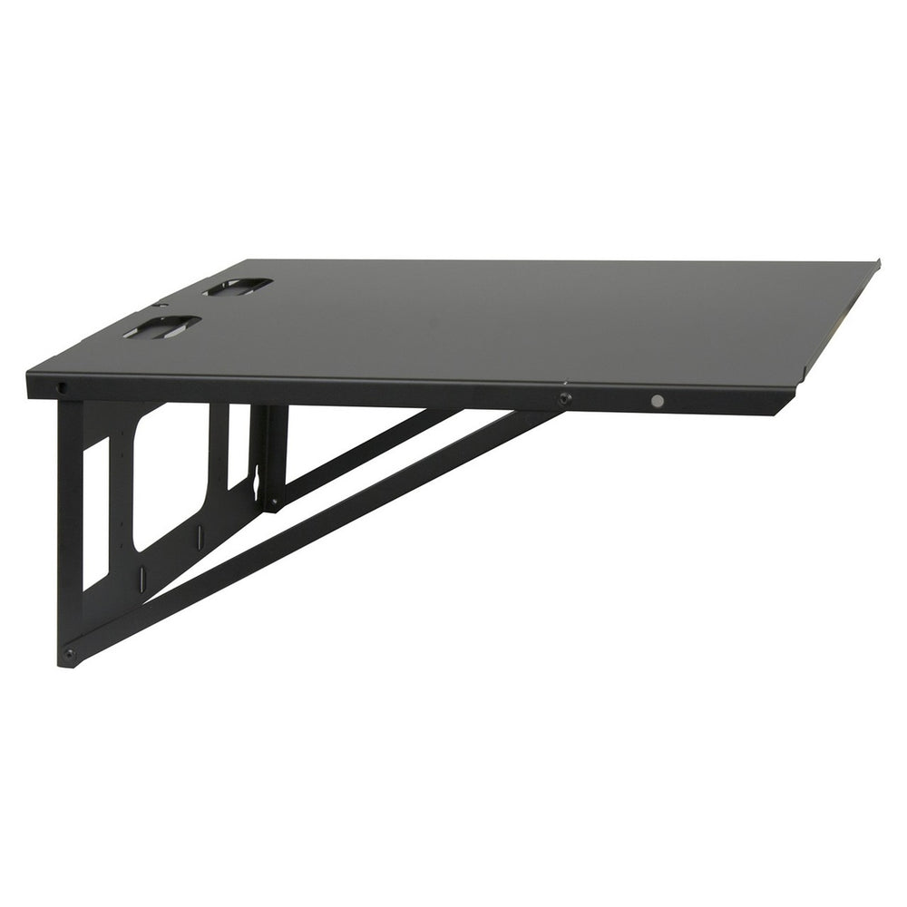 Hinged wall-mount shelf ships flat for warehousing, then folds out to the service position. Flanges insert into rear panel cutouts. Mounts in either direction.