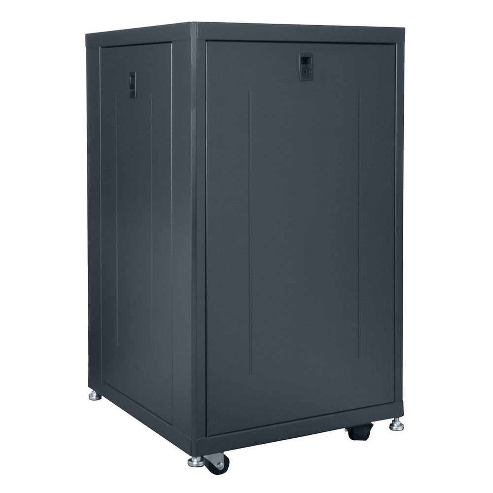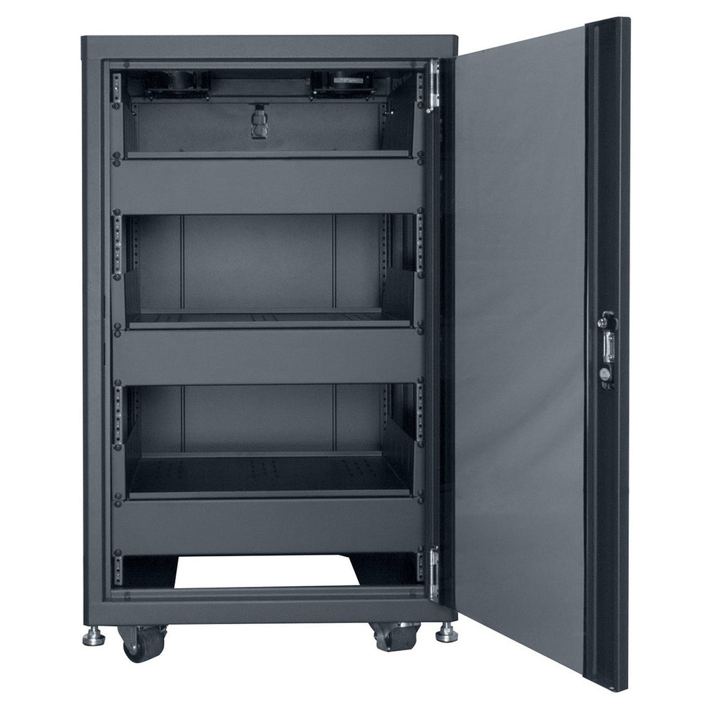 An elegant design made for the high-end decor of boardrooms and home theaters, this ready-to-use rack includes casters, leg levelers, three shelves, three blank panels, two fans, lockable side panels, a rear access cover, and a tempered glass front door. Charcoal Grey textured finish.