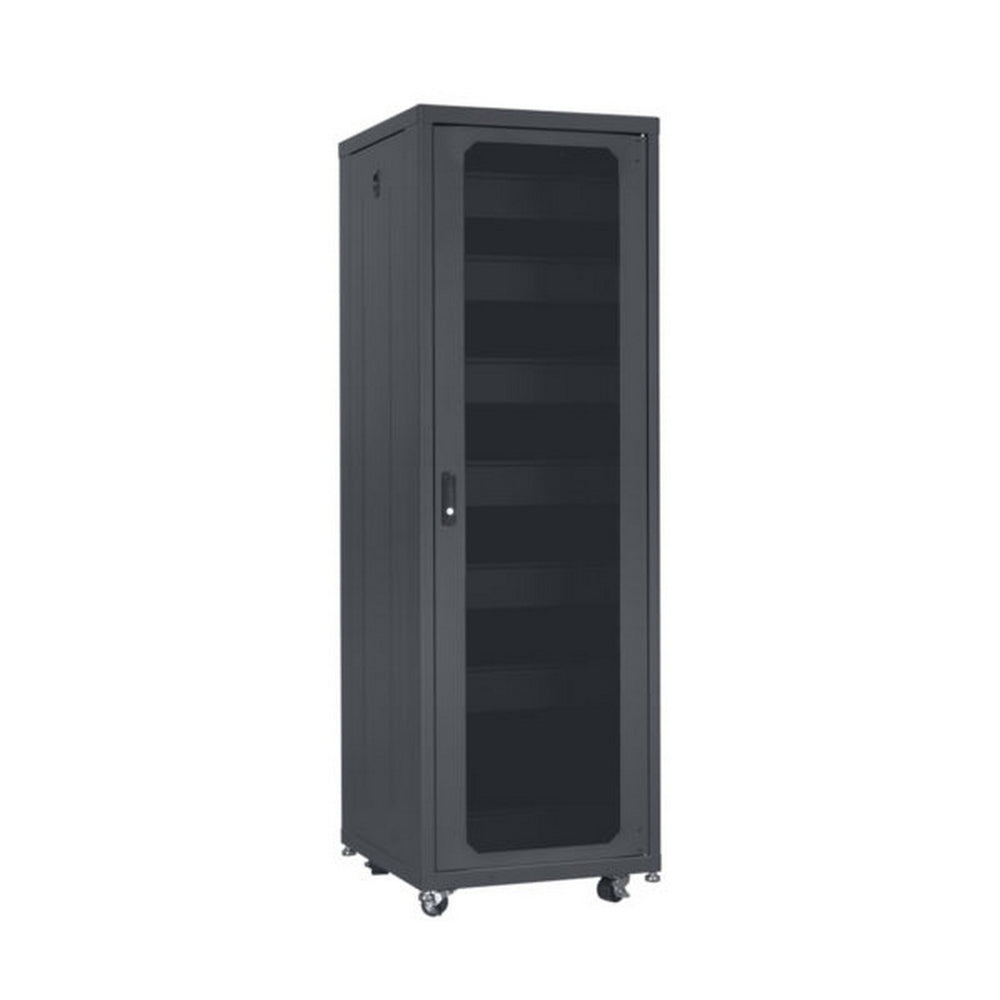 35U x 24” D elegant design for the high-end decor of boardrooms and home theaters, this ready-to-use rack includes casters, leg levelers, seven shelves, seven blank panels, two fans, lockable side panels, a rear access cover, and a tempered glass front door. Charcoal Grey textured finish.