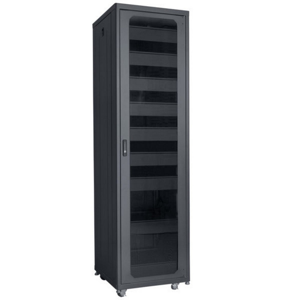 42U x 24” D elegant design for the high-end decor of boardrooms and home theaters, this ready-to-use rack includes casters, leg levelers, nine shelves, nine blank panels, two fans, lockable side panels, a rear access cover, and a tempered glass front door. Charcoal Grey textured finish.
