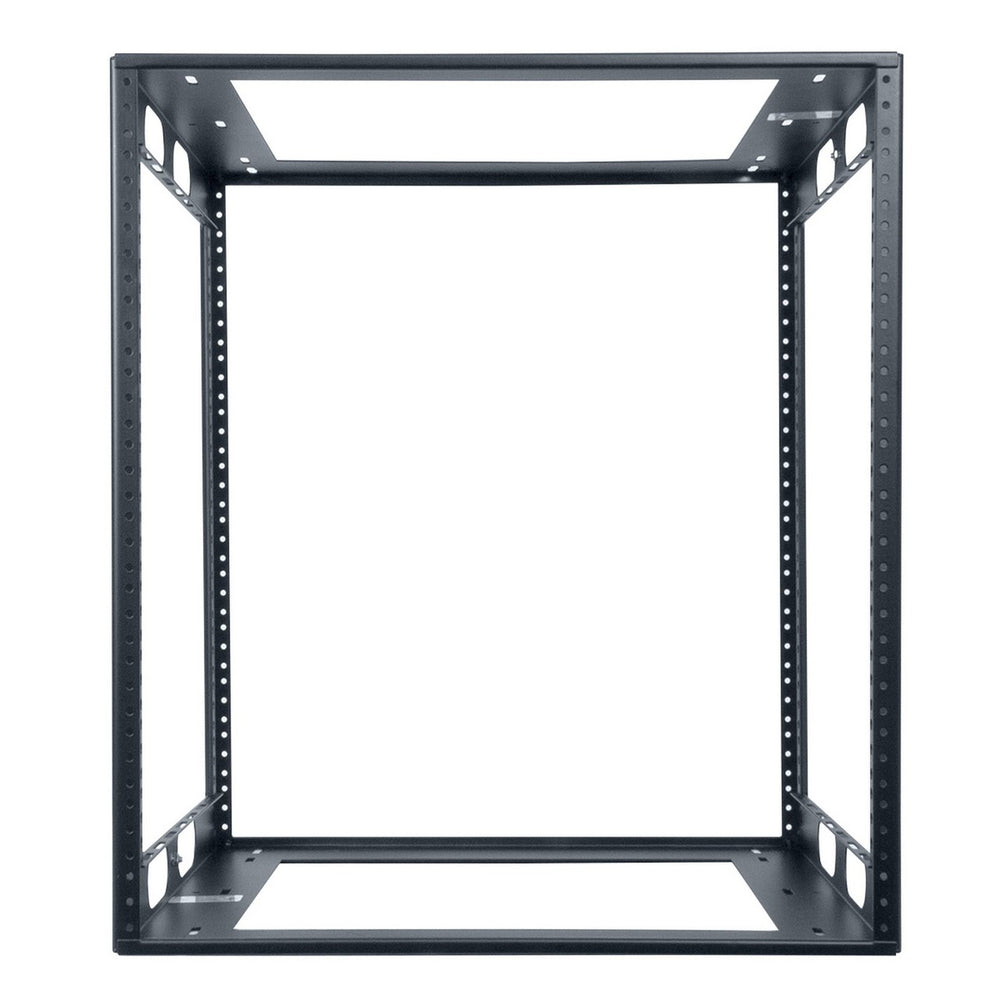 Rugged welded rack for credenzas or cabinets is 16-gauge steel with 11-gauge corner post rails. Ships ready to install.