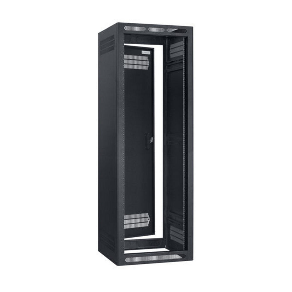 35U x 27”D stand-alone floor rack with adjustable rails is fully welded 16-gauge steel with 14-gauge base, reinforced at all load-bearing junctions.