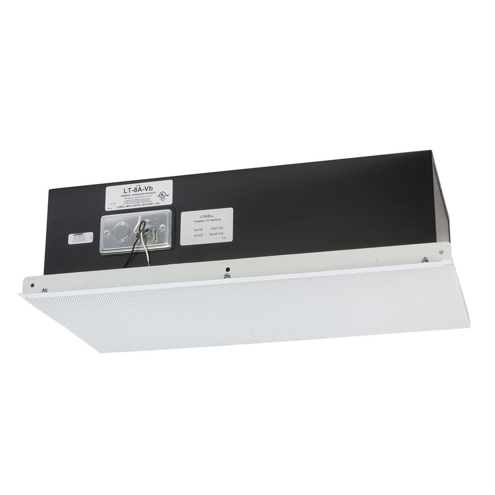 The speaker system for suspended tile ceilings shall be Lowell Model No. LT-8A-Vb. The 1'x2' system shall replace half of a non-tegular 2'x2' ceiling tile or one-fourth of a non-tegular 2'x4' ceiling tile and shall include an integral T-bar to support adjacent ceiling tile. Each speaker system shall include a factory-mounted driver mounted to a sub-plate with a fine perforation steel grille finished in white powder epoxy. The driver shall be 8 in. coaxial with a power rating of 50W. It shall have ceramic magnet weight of 20 ozs. (LF) and 2 ozs. (HF), frequency response of 40Hz-19.4kHz (-6dB) and 40Hz-20kHz (-7.3dB) and average sensitivity of 90.6dB measured 1W/1M. The system shall include a steel backbox (.8 cu.ft.) with acoustic lining, removable dual knockout wiring compartment cover plate with 1/2 in.-3/4 in. combination knockouts, and leads exiting through a metal clamp.