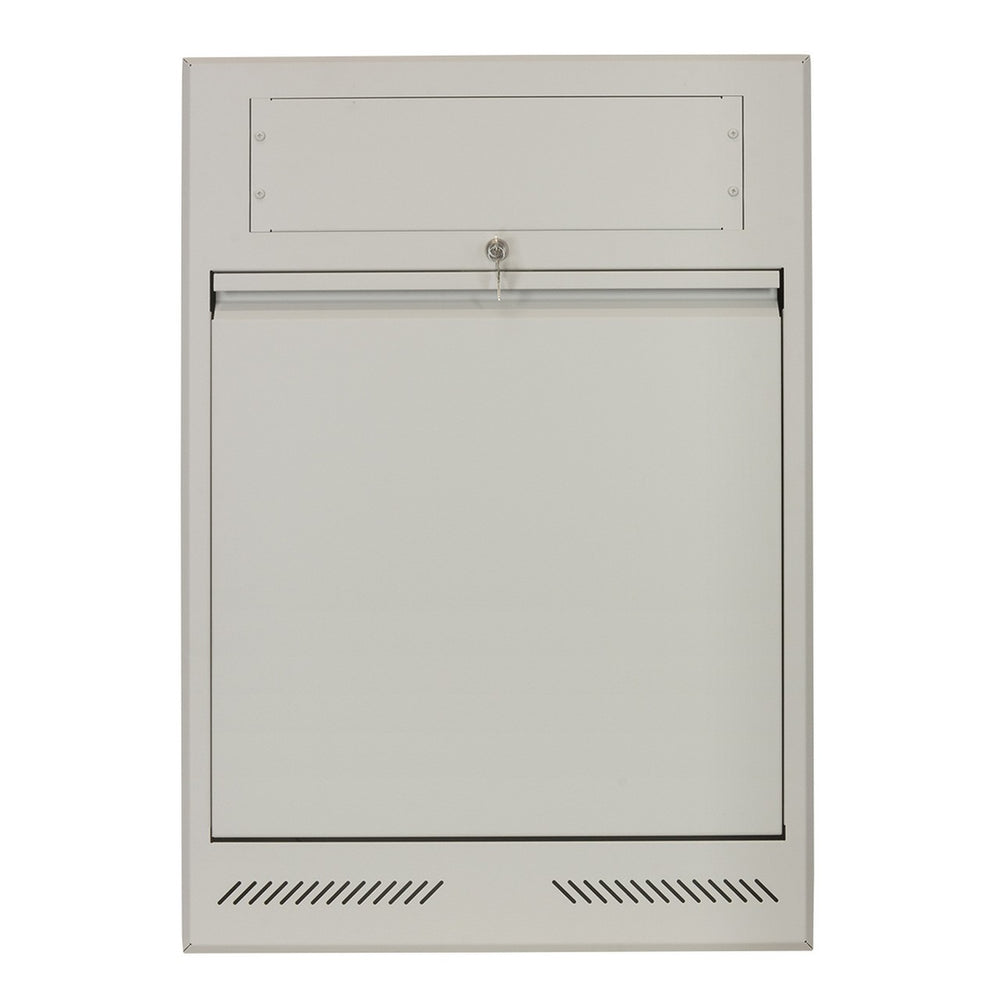 - Surface-mount wall rack features steel construction with beveled edges and Network Grey finish, vents in front and base, and compound knockouts for cables (top and base).