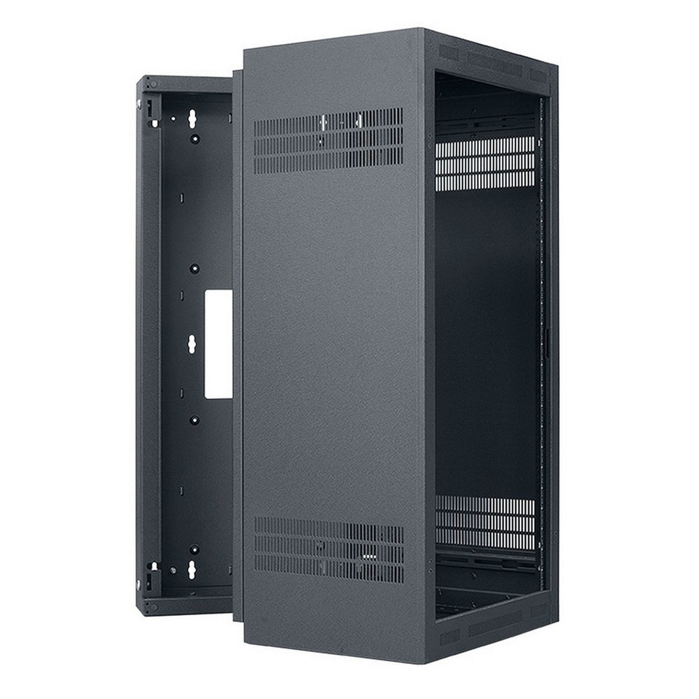 Heavy duty sectional wall rack features a front section that swings open to access wires and equipment.
