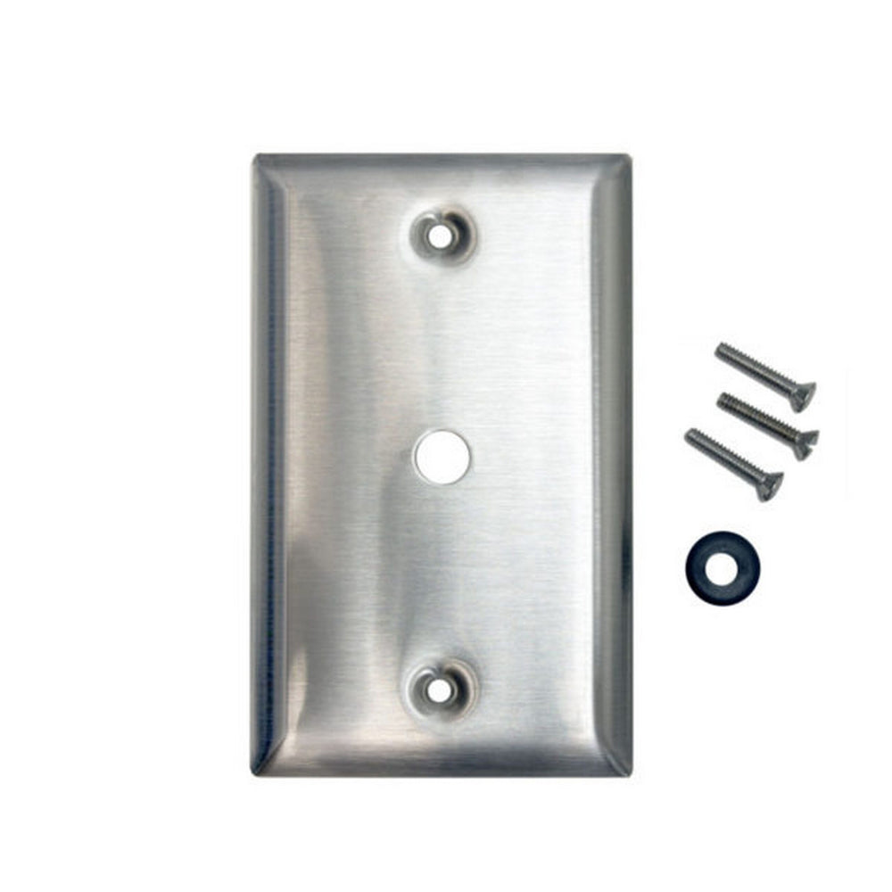 One-gang stainless steel wall plate with center hole punched for a microphone, not included.