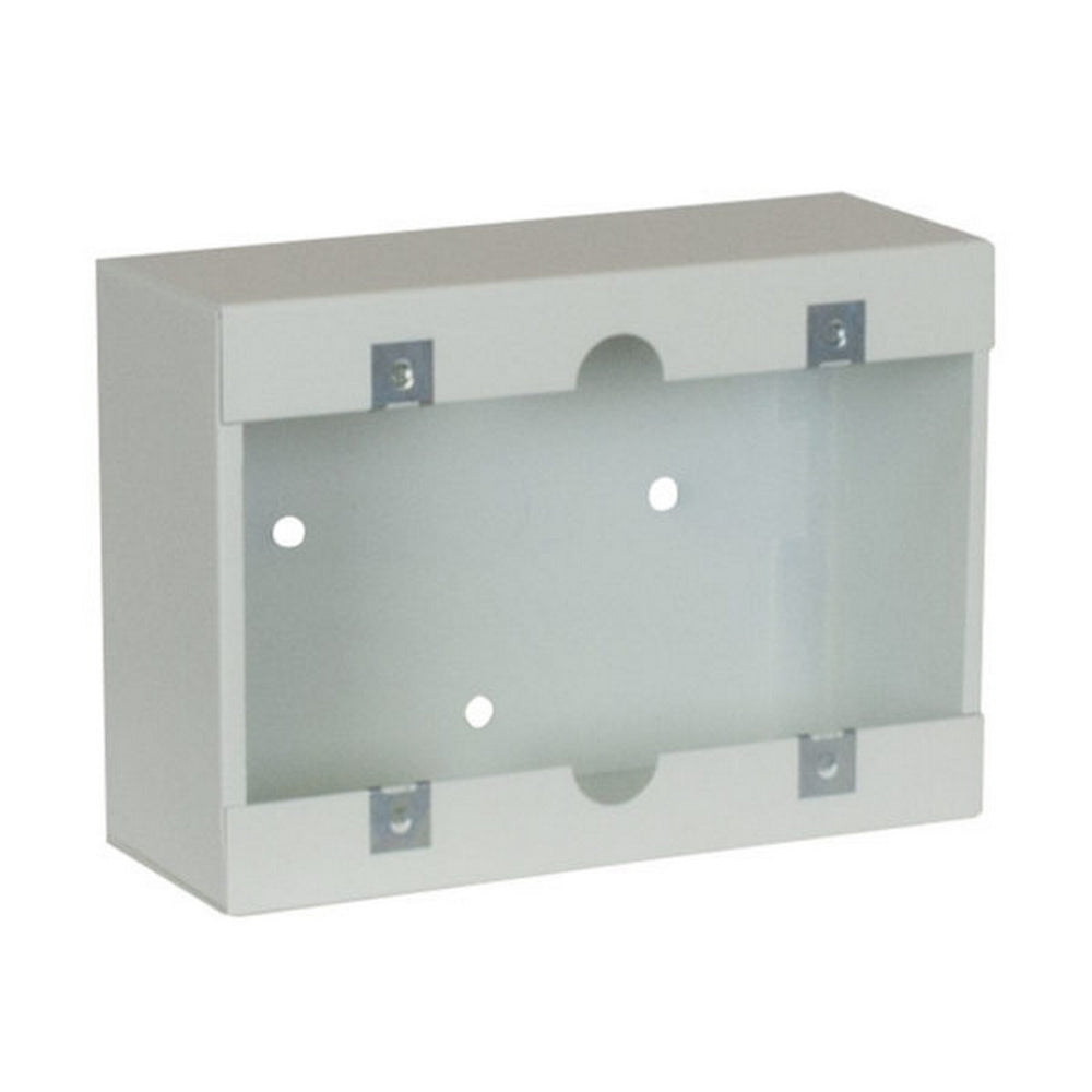 Three-gang steel surface-mount box with white powder epoxy finish for Lowell three-gang devices.