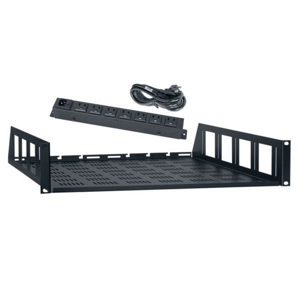 This bundle includes a 19 inch rackmount utility shelf with vented base plus a power strip. The shelf has notches to mount the power strip on the back. Both products are made in the U.S.A.