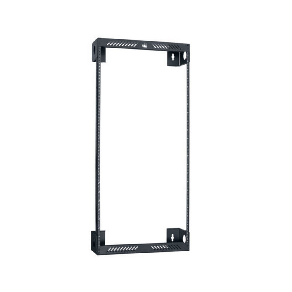 Slim open-frame wall rack mounts 19"W equipment to a wall or backboard. Top and base are heavy gauge steel that can be mounted on 16" centers to form a stable platform for patch panels, routers, switches, telecommunications, or computer equipment. Ships unassembled.