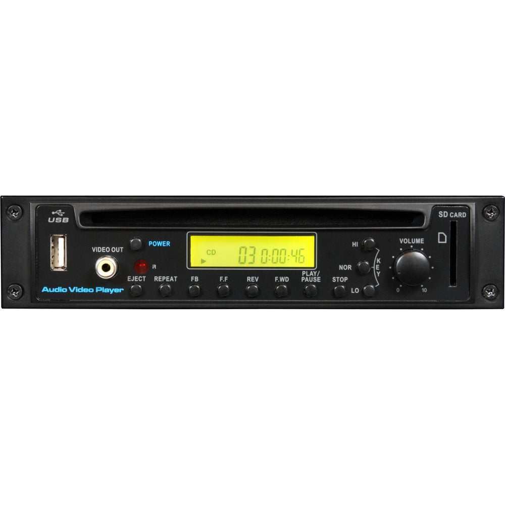 The RM-CDV player will play DVD, VCD, CD+G, JPG, CD, and MP3 formats. This DVD, CD, & MP3 player also features a remote control, an SD card reader, as well as USB input. The RM-CDV also includes a video output for use with VCD, CD+G, & JPG files. This will plug into a TV monitor or projector. The front panel features and functions include: LCD display, source selector, Fast Forward, Reverse, Play/Pause, Stop/Eject, & Hi, Normal, Low pitch control. A wireless remote control is also included.