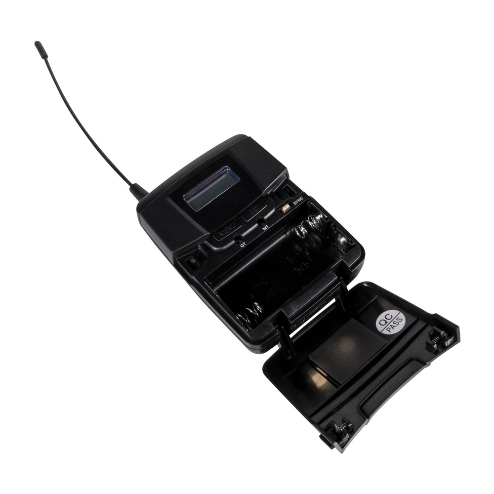 Its multi-function LCD displays channel, frequency, battery type, and power level. It runs on two AA batteries (alkaline or NiMH) for up to 16 hours and offers both high/low impedance gain controls to accommodate various mic types.