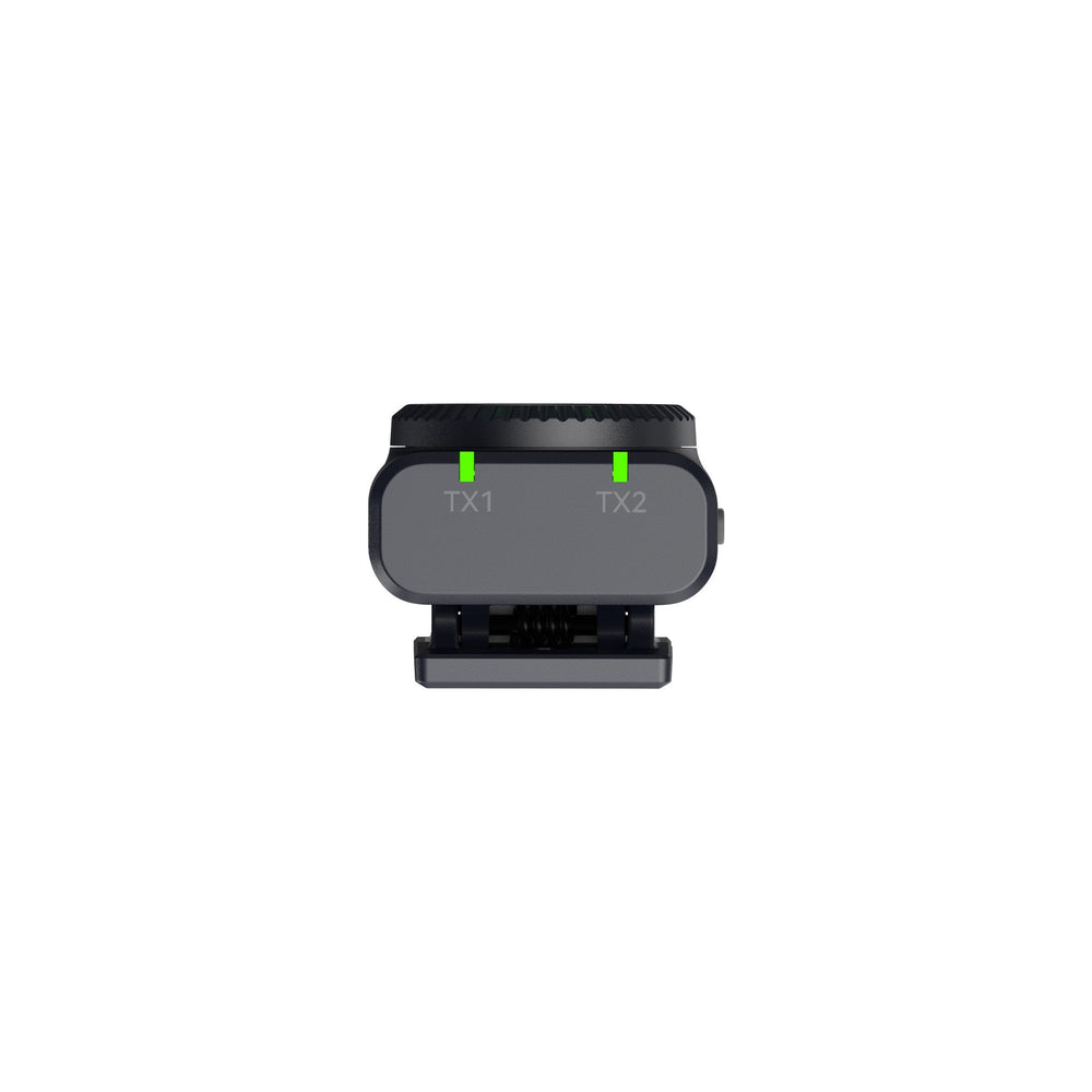 The receiver features plug-in, class-compliant USB-C connector design compatible with both iOS and Android devices. Onboard controls allow you to toggle noise cancellation and pairing. The receiver runs on plug-in power from your connected device. LED indicators show the mode status of each transmitter unit.