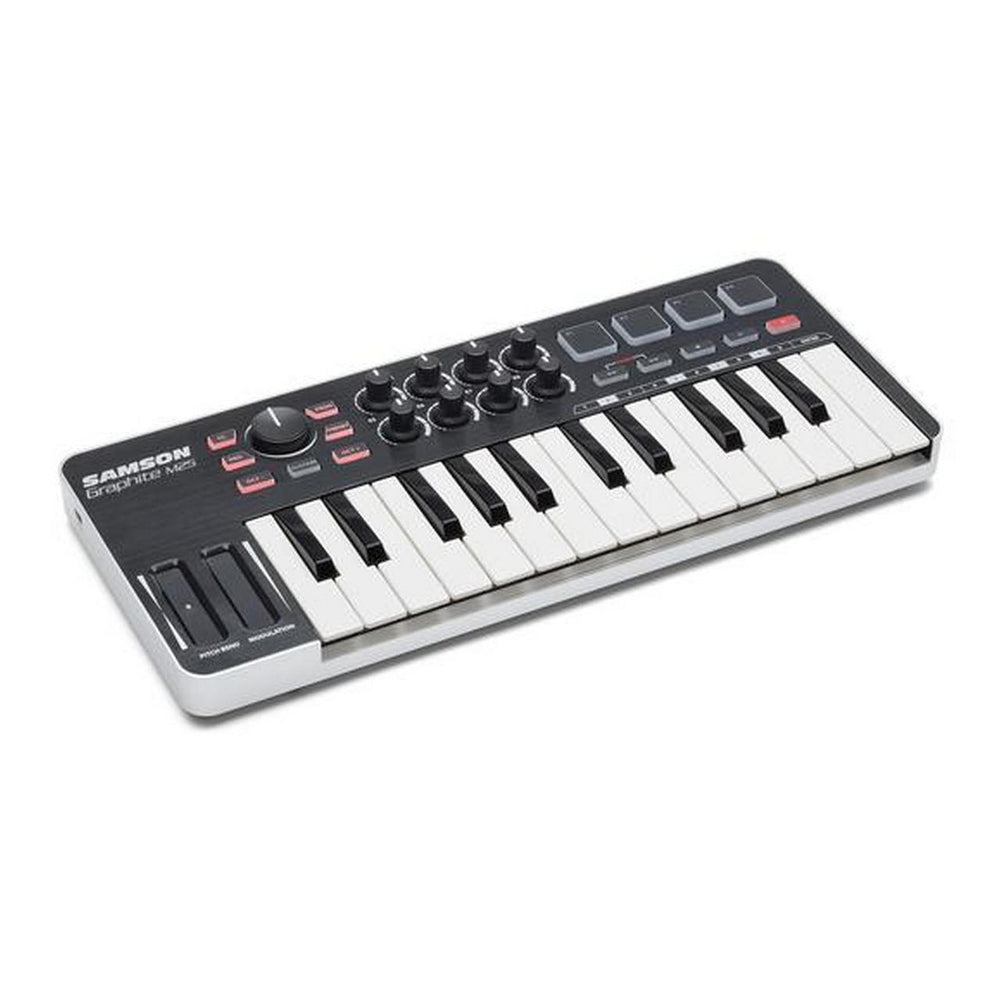Samson's Graphite M25 USB MIDI Controller gives you all the music production control you need for home studio and mobile applications. Packed into an ultra-portable design, the Graphite M25 features a 25-key velocity-sensitive mini keyboard, trigger pads with aftertouch, a full-featured control surface and additional programmable functions for advanced playability and customization. And with iPad/USB bus power and plug-and-play operation, the Graphite M25 makes it easy to express your most dynamic musical ideas, no matter where creativity strikes.