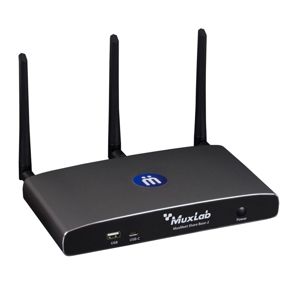 MuxMeet Share Base-2 (Model: 500829) is a wireless conference room product that has been designed to meet today’s hybrid workforce’s requirement supporting not only local presentations but also allowing the user to collaborate with remote participants. It enables people to connect the room camera, mic, speaker (such as the MuxMeet Videobar, model: 500820, sold separately) and display with their own laptops wirelessly, so people can take advantage of room A/V system to collaborate with both in-room and remote meeting participants, without cable limitation and hassle.
