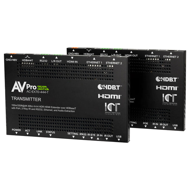 The AVPro Edge AC-EX70-444-KIT is an 18Gbps HDBaseT extender kit built to extend HDMI 2.0 video and audio over Cat6A copper cabling. It is designed for 4K60 4:4:4 distribution with HDR support for professional AV installs where image fidelity matters.