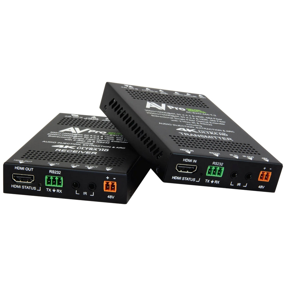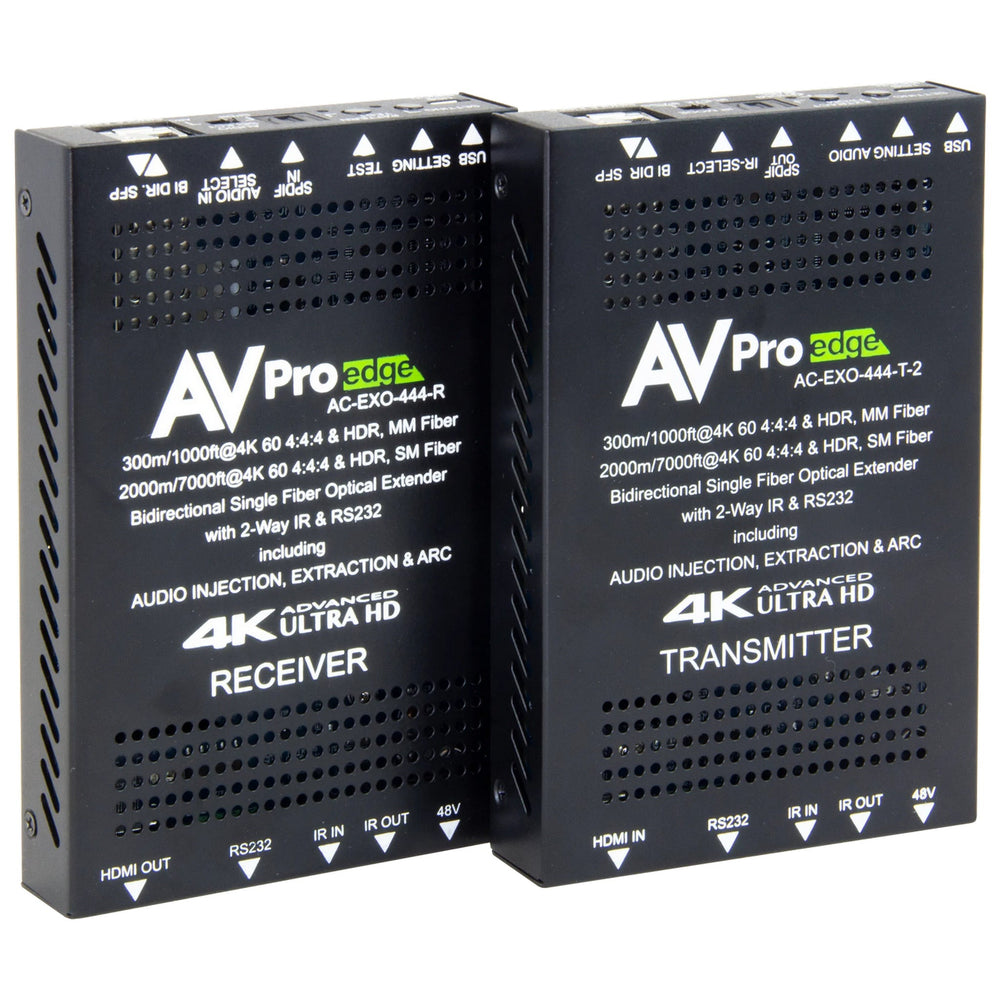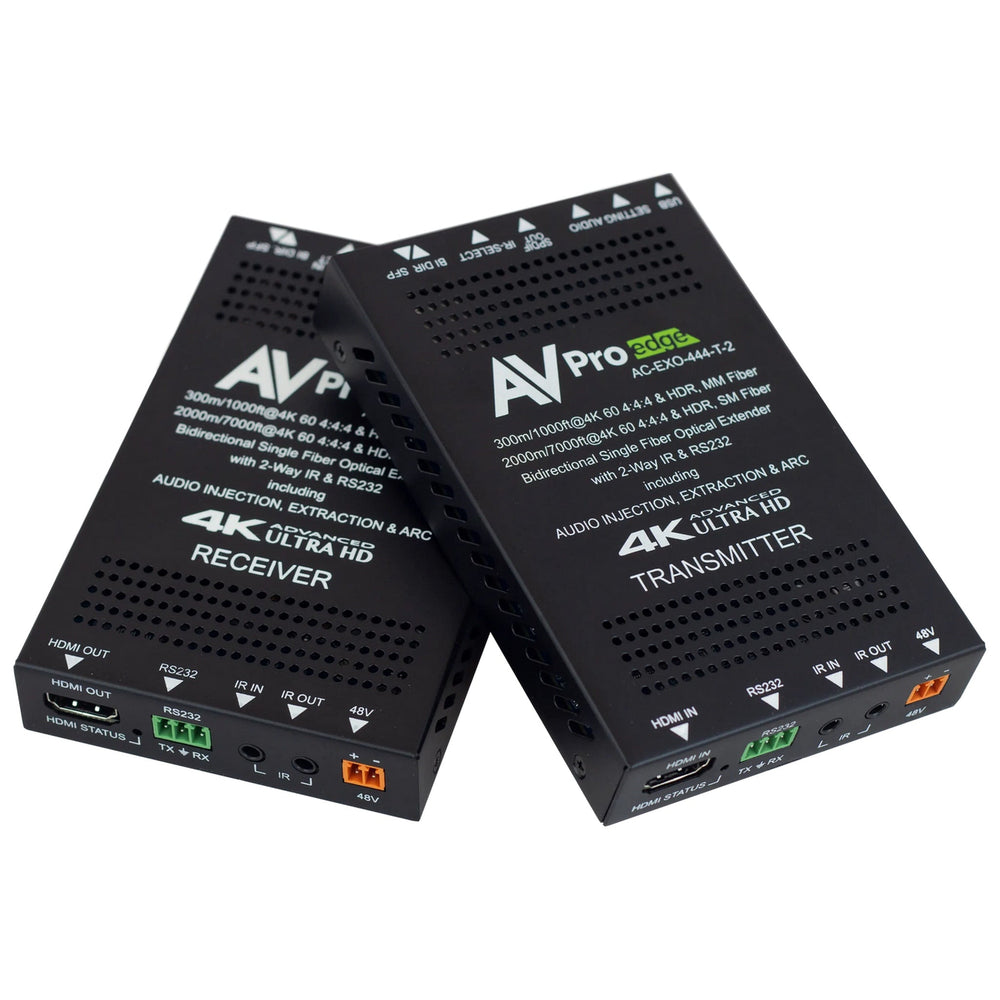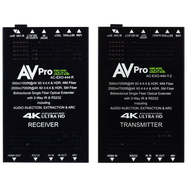 The AVPro Edge AC-EXO-444-KIT is a single-mode fiber HDMI extender kit built to extend 18 Gbps HDMI 4K/60 fps video over long distances. It supports HDR workflows and is designed for visually lossless transmission using Invisible Compression Technology. Use it to push 4K content to remote displays in commercial, industrial, and large residential installations.