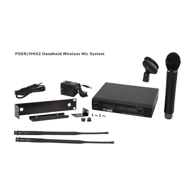 The PSER receiver provides 16 selectable UHF channels, infrared sync for fast transmitter pairing, and clear RF and AF indicators for monitoring wireless performance. The HH52 handheld transmitter features a dynamic capsule for strong vocal clarity and stable wireless transmission. Together, the components deliver dependable audio performance for small to medium sized venues and mobile setups.
