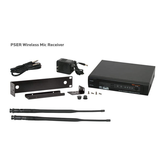 The PSER receiver provides 16 selectable UHF channels, infrared sync for transmitter pairing, and clear RF and AF indicators for monitoring system activity. A mixed 1/4 inch output allows simple connection to mixers, speakers, or amplifiers. With included rack ears, antennas, and mounting hardware, the PSER can be installed easily into portable racks or fixed audio setups.