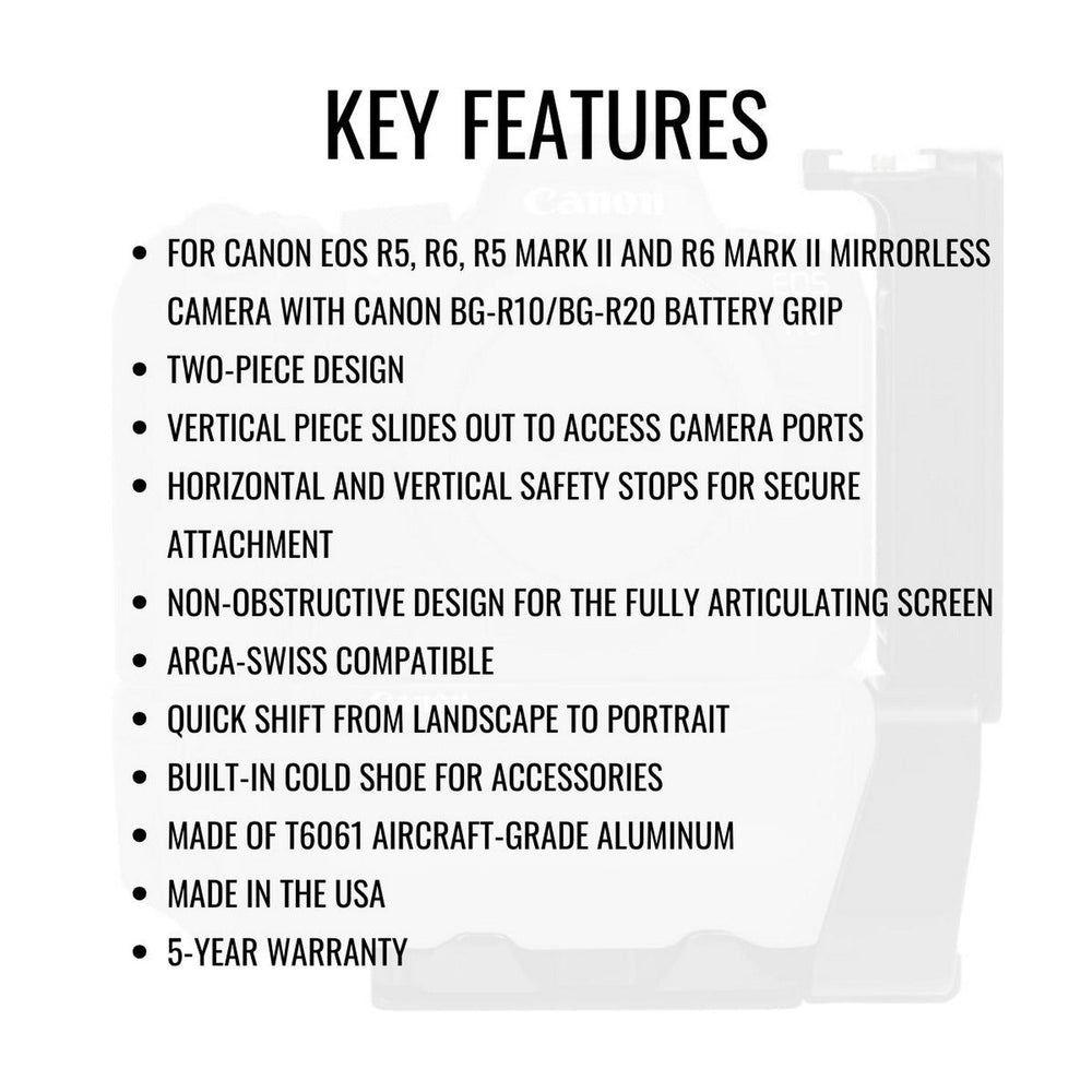 The ProMediaGear PLCBGR10 Arca-Swiss L-Bracket is a precision-machined support solution designed for Canon R5 R6 R5 Mark II and R6 Mark II mirrorless cameras using the BG-R10 or BG-R20 battery grip. It allows fast switching between landscape and portrait orientations while maintaining a secure and balanced camera setup.