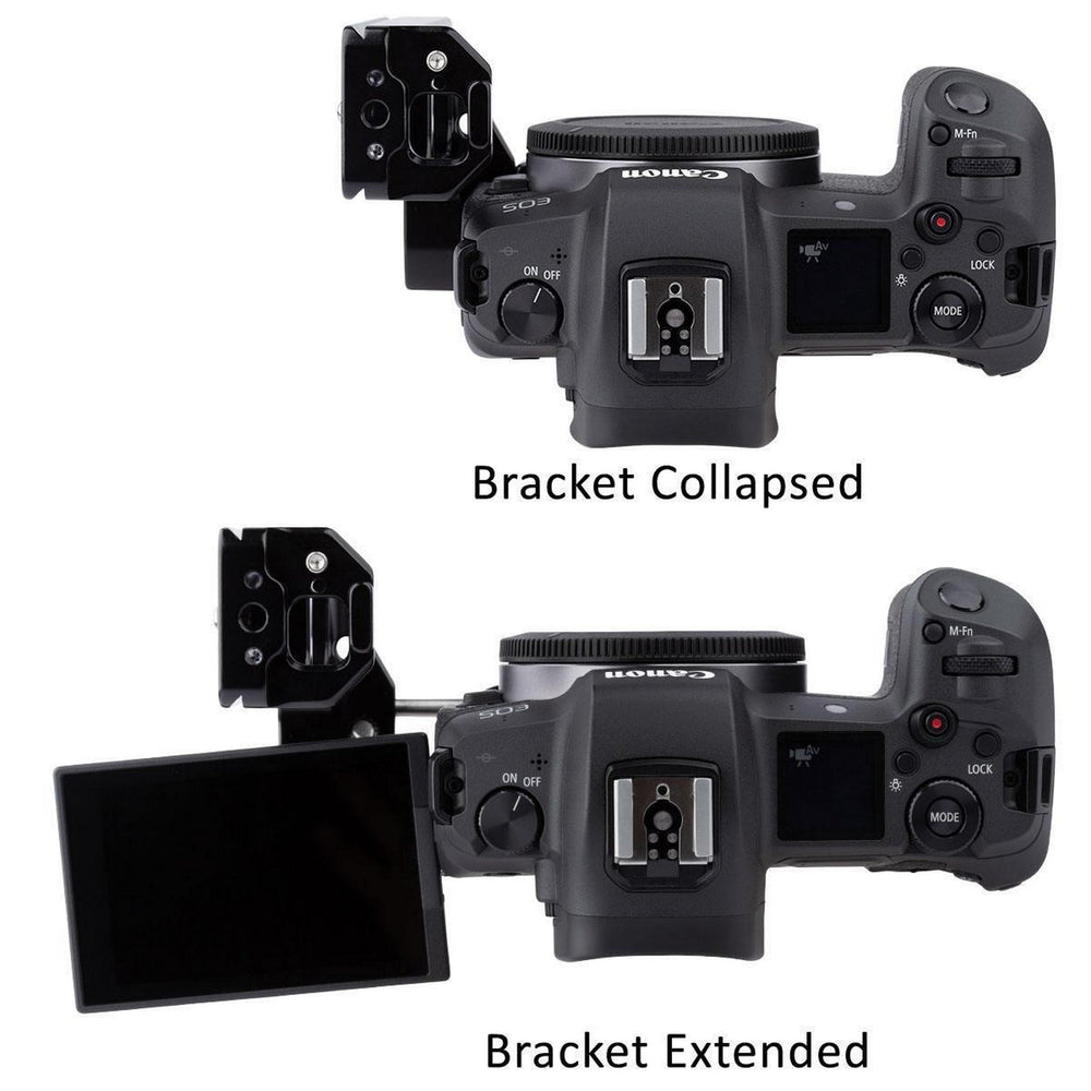 This two-piece L-bracket design is Arca-Swiss compatible and features an extendable vertical plate to maintain access to articulating screens and cable ports. The offset structure helps keep controls and compartments accessible during tripod use.