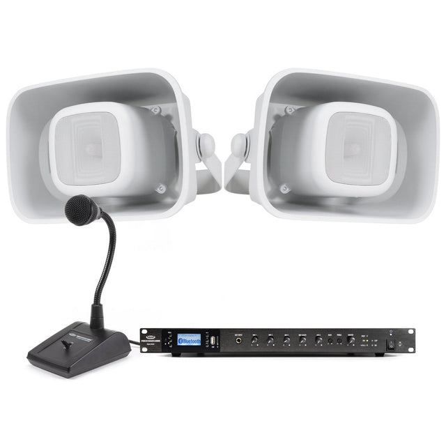 Pure Resonance Audio Paging Audio System with (2) H6 6.5-Inch All-Weather Horn Speakers, RMA240BT 240W Bluetooth Mixer Amplifier, and PTT1 Paging Microphone