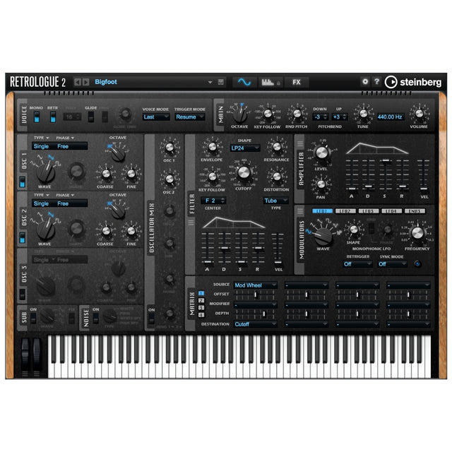 The flexible, intuitive Retrologue emulates the warmth and fatness of classic analog synthesizers. Three virtual analog oscillators and a first-class set of filters produce a wealth of rich, inspiring sounds; its adaptable arpeggiator, powerful modulation system and FX rack help make Retrologue the first choice for producers everywhere.